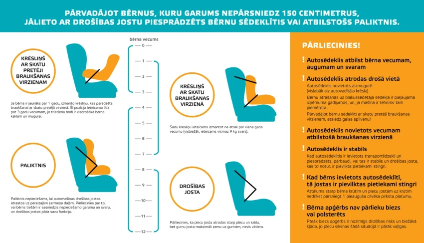 Tāpat ir vērts atcerēties formulu 150×12. Tā ir bērna drošības formula automašīnā. Proti, 150 nozīmē auguma garumu centimetros, bet 12 – bērna vecumu, līdz kuram iesaka lietot sēdeklīti vai paliktnīti.